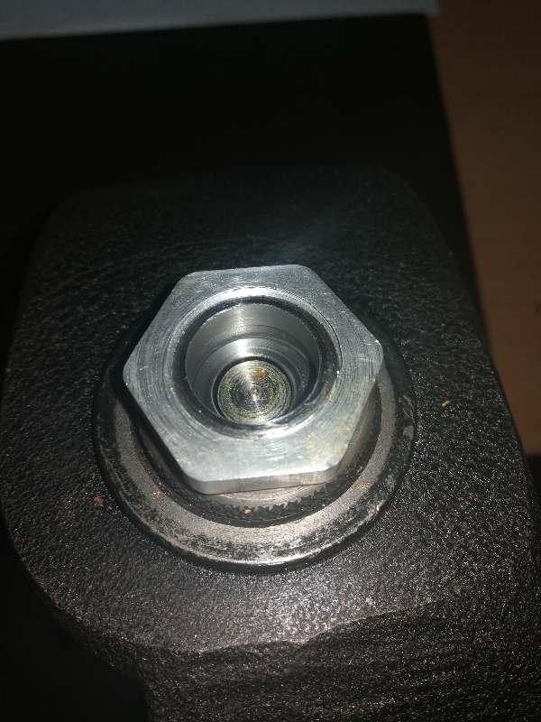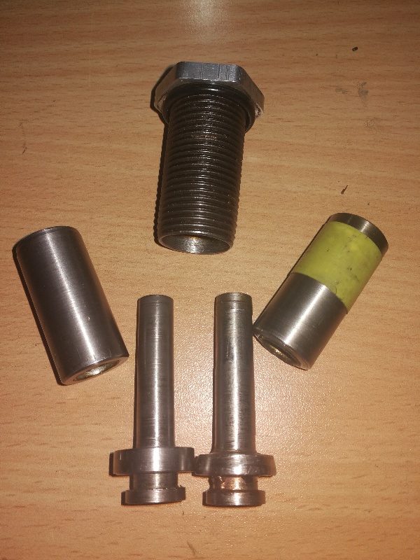 This is just a threaded bar with die body threads, drilled through then lathe turned to accomodate the diameter of the Lyman / RCBS lube sizing dies. It has a step at the top to prevent the die from moving up and out.