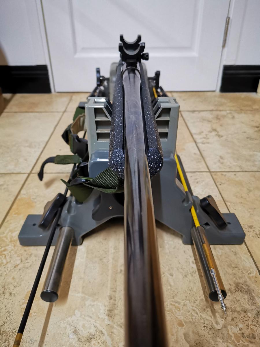 Start by placing the rifle in the stand, and securing it so that it will not move while this operation is in progress.