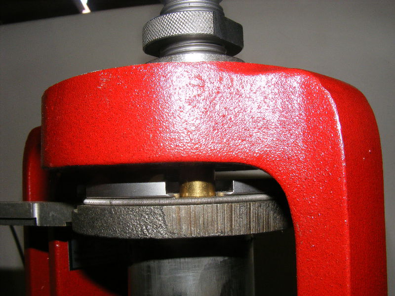Screw the die body in slowly, until it contacts the case rim. This is the point at which no crimp is actually applied, but is the start point for setting the crimp.