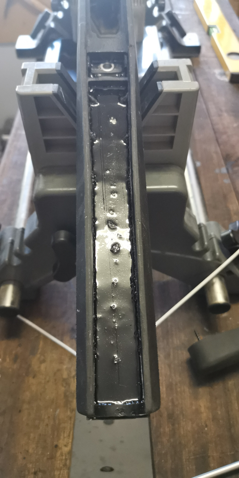 This part of the stock uses 120 ml of epoxy to fill, and the epoxy has a relative density of just over 1, so the stock is now 120 grams heavier. If you want extra weight, just mix in the required weight of lead shot before pouring.