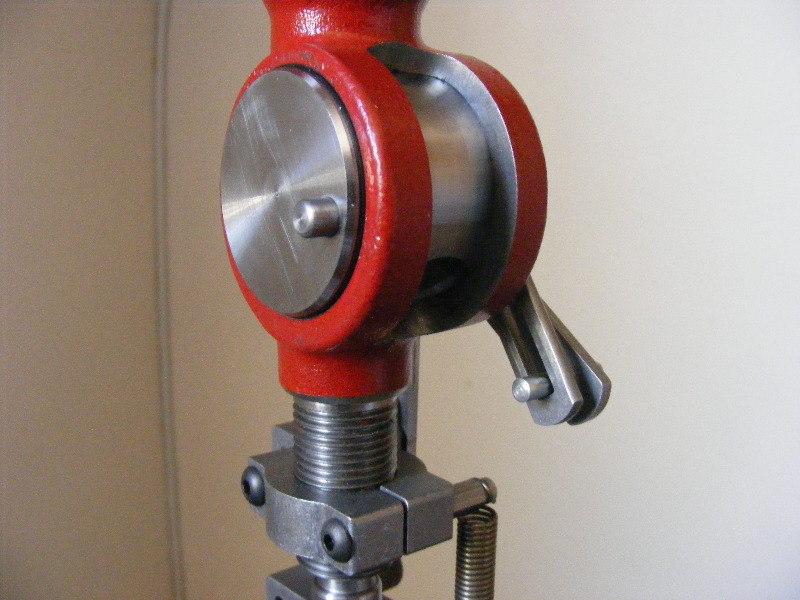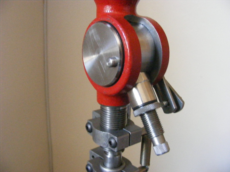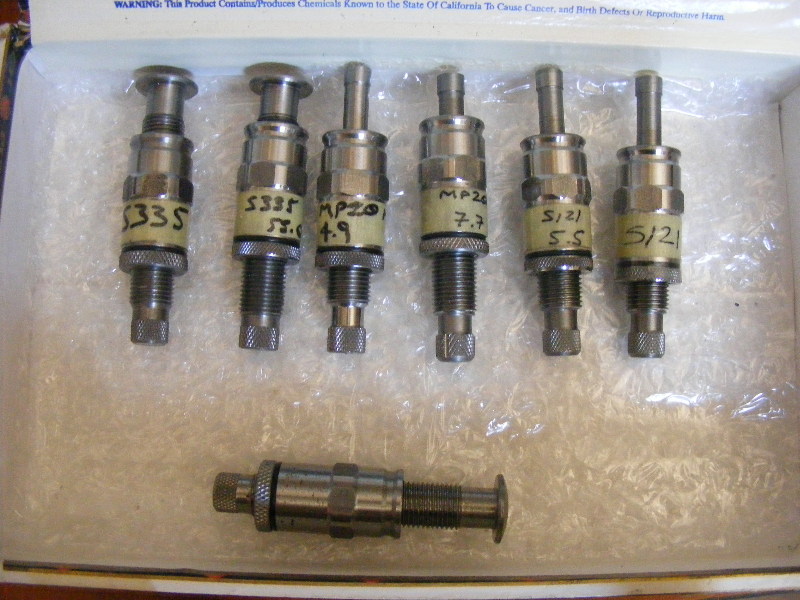 Note that there are two types of powder measure inserts in the box. On the top left, the inserts have a mushroom shaped ends. On the right, dowel shaped. The first type is more suited to large volumes of powder, such as rifle. This insert can dispense in excess of 100 grains of powder.