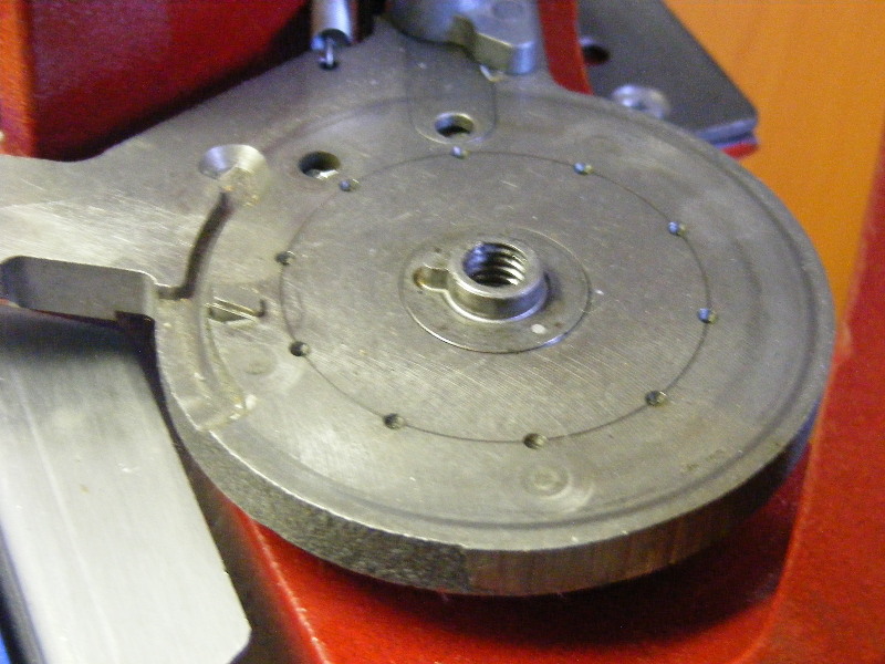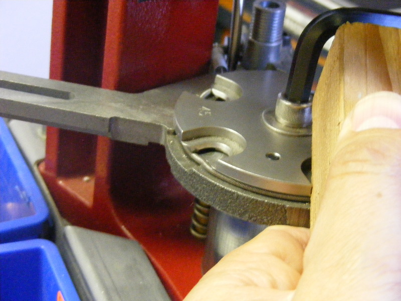 You need to remove the hex-head bolt in the middle of the shellplate. I use a small block of wood to hold the shellplate from rotating while the bolt is undone. Raise the ram a few centimeters while this is being done, to clear the ram off the indexing mechanism.
