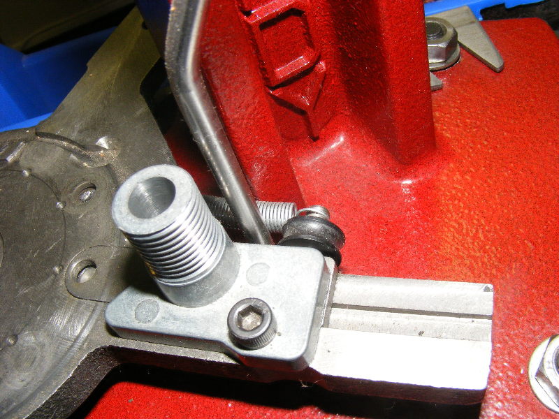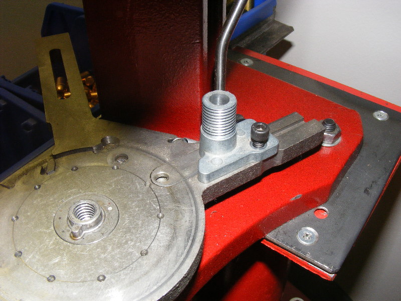 The priming assembly removed. See the primer punch in the frame - that also needs changing between large and small pistol primers.