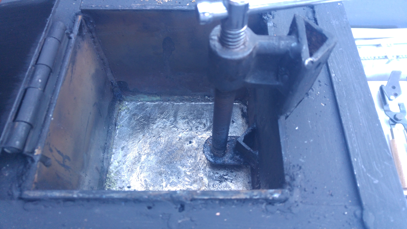 The screw valve here is cut from a C-clamp. I had a 6" C-clamp with no foot on it, and it was easier to cut and weld than machine another taper on the lathe. Using a donor C-clamp is the easiest way to make a bottom pour valve using only a hand drill and some fine sandpaper.