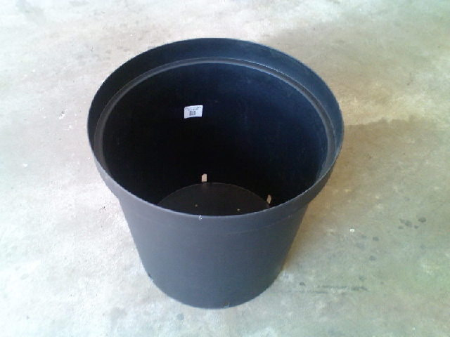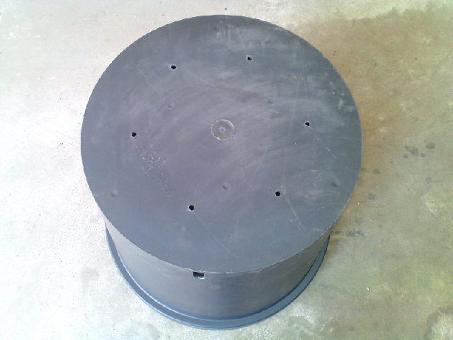 In this case I picked a plastic planter. The size was 45cm diameter at the top. This one was rimless. As you'll see later, it makes a great base, but it's overkill. A 35cm diameter pot works well, depending of course on the size of the press. With this size, you could mount any press, it's that heavy.