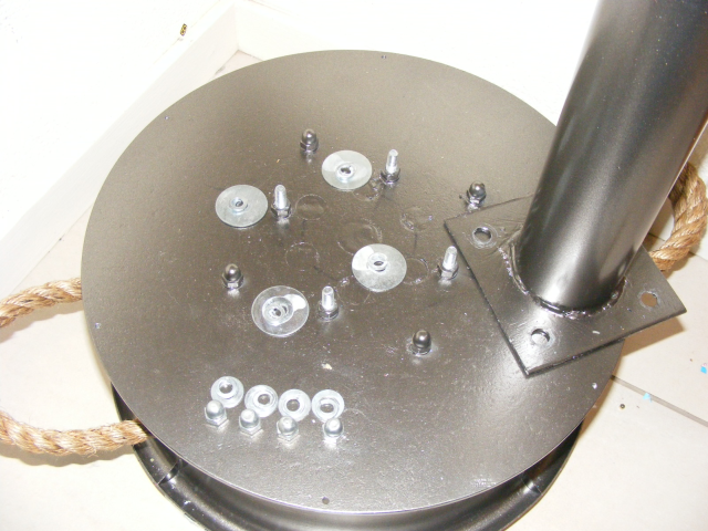 Press stand and press base seperated, and all washers removed. The nuts locking the threaded bar to the base are visible.
