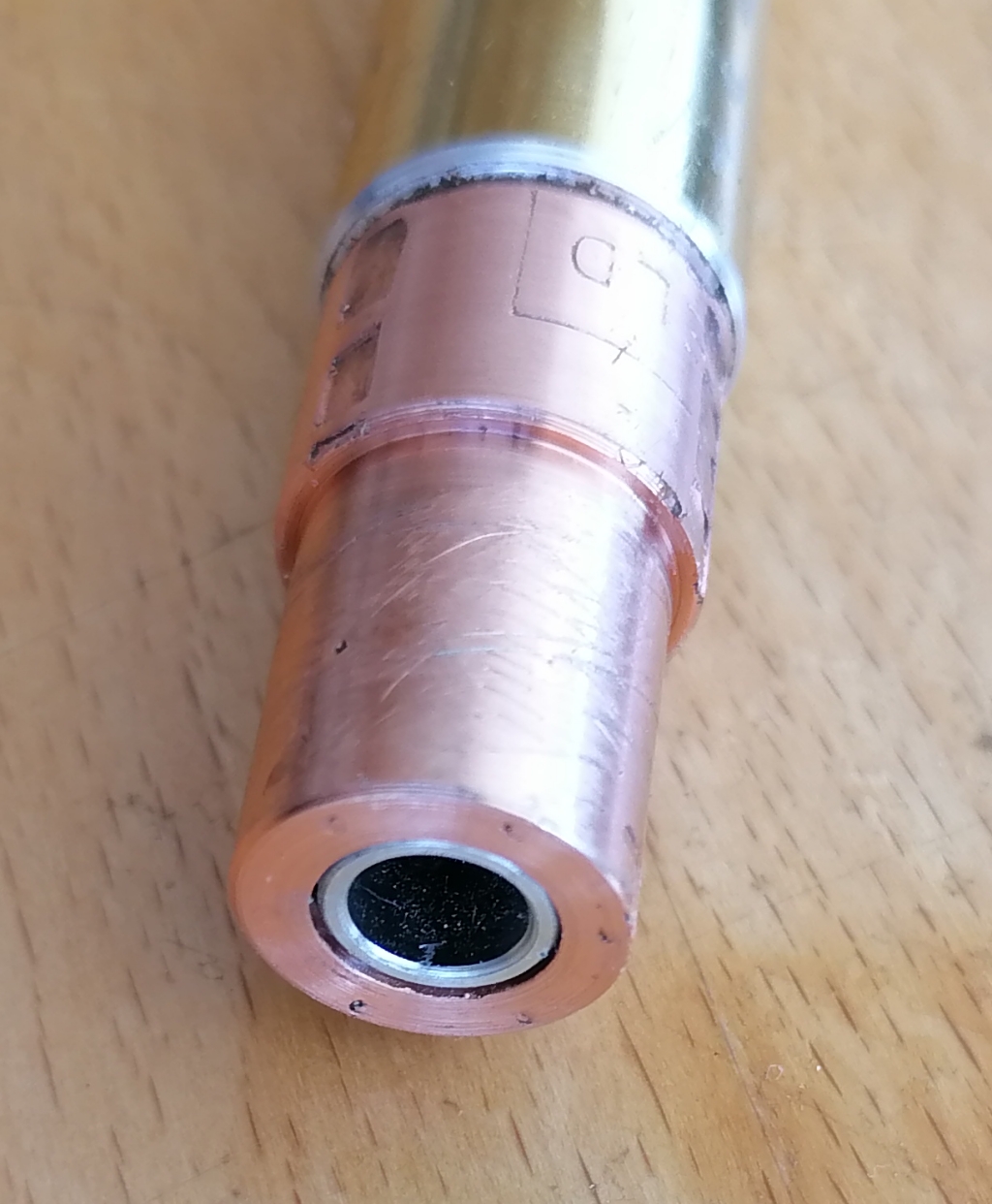 My tube housing replacement was an offcut piece of curtain rail. The diameter and thickness of the tube is not critical. The outer tube needs to house an 8mm primer tube. The primer tube will be held centered in the housing by the machined adapters. You'll make the adapters fit whatever tube you have to the priming body and the priming tube. To make the tube primer housing adapter for the primer tube, I used an acetyline torch nozzle, machined to size and drilled through to 8mm . This was machined to press fit into the tube housing.
