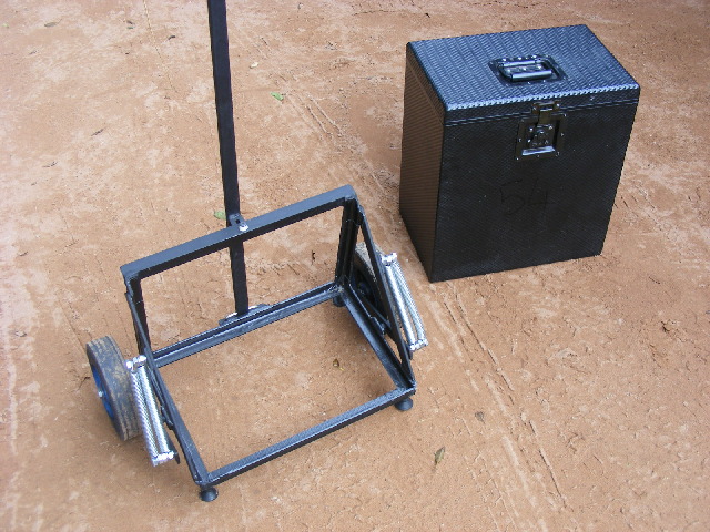 Frame modified. Removed the side springs, replaced with one spring each side at the rear. Replaced solid rubber wheels with inftlatable wheelbarrow wheels. With the inflatable wheels, the double spring was not necessary, and travel over sand and gravel is much easier.