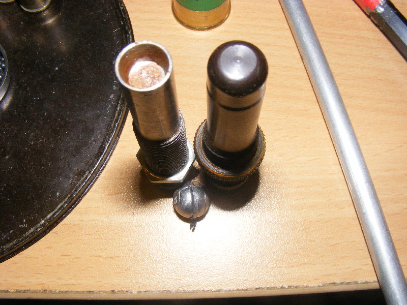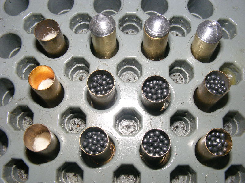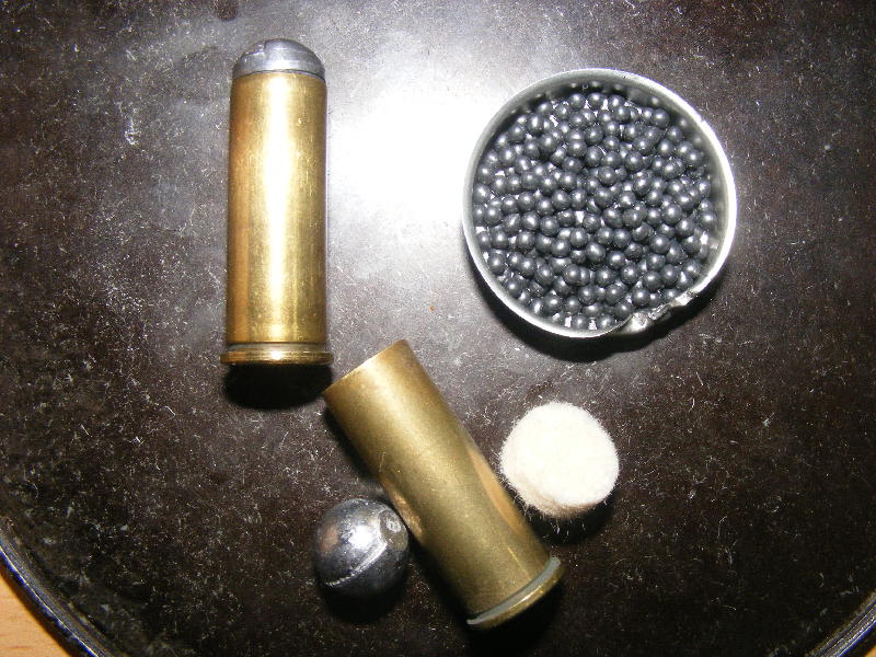 The amount of shot is not measured, just put enough in the case so that there is space for the lead ball to be seated. In this case, leaving about 5mm between the level of shot and the case mouth worked fine.