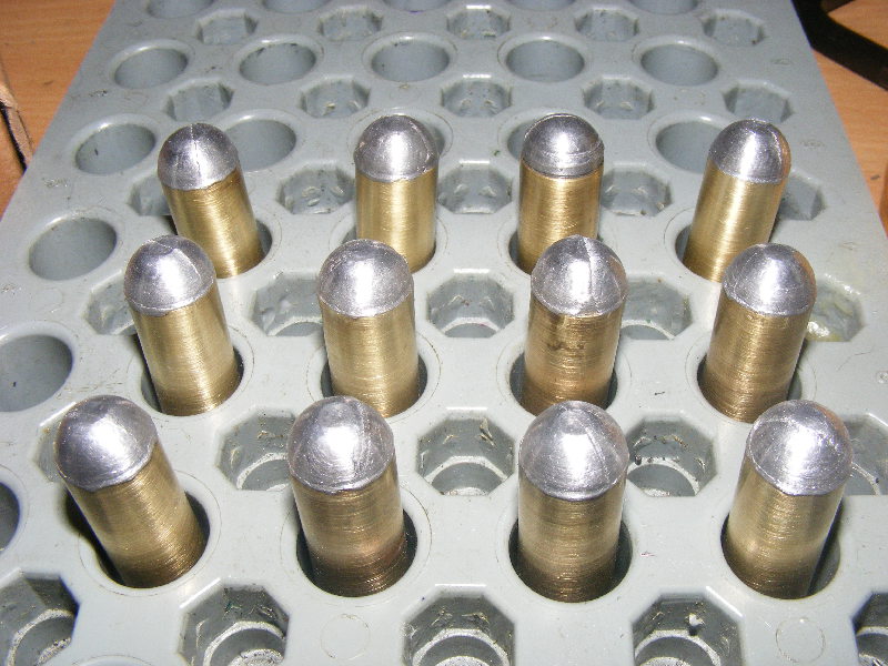 All the loaded rounds, seated, not crimped yet. Except for the three rounds back right which were the test pilots.