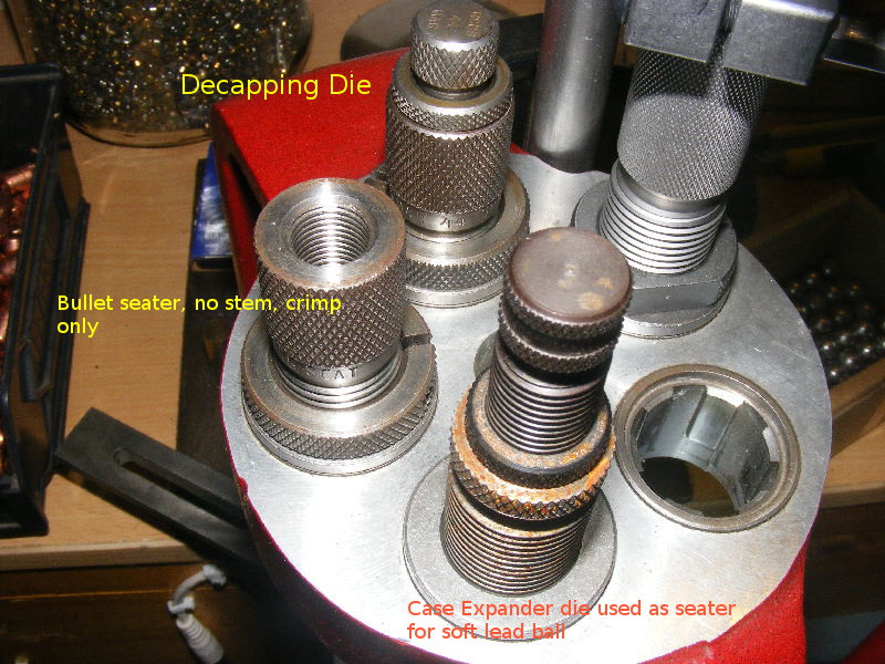 The seating die is replaced with the case expander, which is used to seat the lead balls.