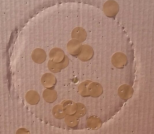 At five meters [ 5.5 yards ], most of the shot is within the 0-down ring of an IDPA target, which is 20 centimeters [ 8 inches ] in diameter.